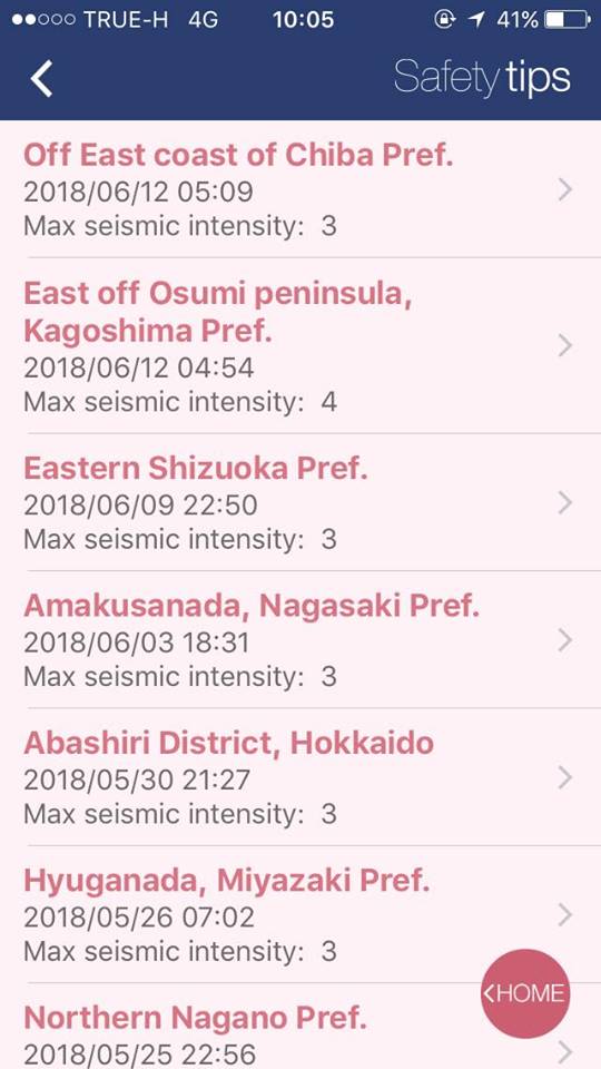 ในหน้าแรกของแอปนั้นจะแสดงพื้นที่ในประเทศญี่ปุ่นที่เกิดเหตุการณ์แผ่นดินไหวครั้งล่าสุด พร้อมทั้งตัวเลขที่แสดงถึงระดับความรุนแรงในแต่ละพื้นที่ ซึ่งผู้ใช้งานสามารถตั้งค่าในภายหลังได้เองว่าจะให้แอปส่งการแจ้งเตือนสำหรับแผ่นดินไหวทุกระดับ หรือมากกว่าระดับใดขึ้นไป และยังสามารถเลือกรับการแจ้งเตือนเฉพาะในบางจังหวัดของประเทศญี่ปุ่นตามเมืองที่เราเดินทางไปท่องเที่ยวได้อีกด้วย นอกจากนี้หากเกิดแผ่นดินไหวขึ้น นอกจากการแจ้งเตือนทั่วไปแล้ว ภายในแอปจะมีข้อมูลบอกเราอีกว่าหากเกิดแผ่นดินไหวในระดับดังต่อไปนี้ ควรเตรียมการหรือรับมืออย่างไรบ้าง ซึ่งข้อมูลทุกอย่างนั้นเป็นภาษาอังกฤษทั้งหมด